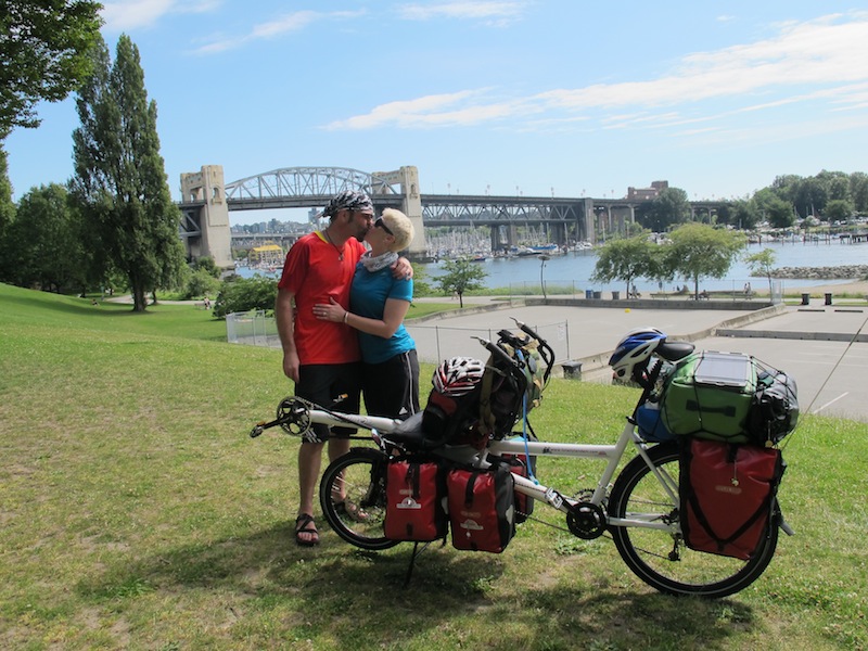 Last Thursday we did our first kms with a fully loaded bike. She’s a heavy beast to be sure! Finding all the right spots for all our gear was like a mega game of tetrus, but as Brendon is the master of packing, we managed to get all the gear in place and slowly, really slowly, get on our way. We cycled about 40km from Vancouver heading to Squamish and loved every minute of it. She really is a dream ride. The hills are quite testing with all our gear (we reckon about 50kg) but once we got our team mojo flowing, the balance and synchronicity came together nicely.
