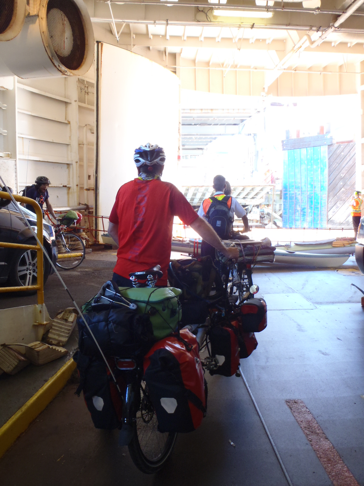 ‘2 people, 1 bike’ I say to the ferry attendant. We grab 2 cans of coke, board the ferry, lock up Falkor, head up deck and promptly fall asleep. It was  12:45pm.