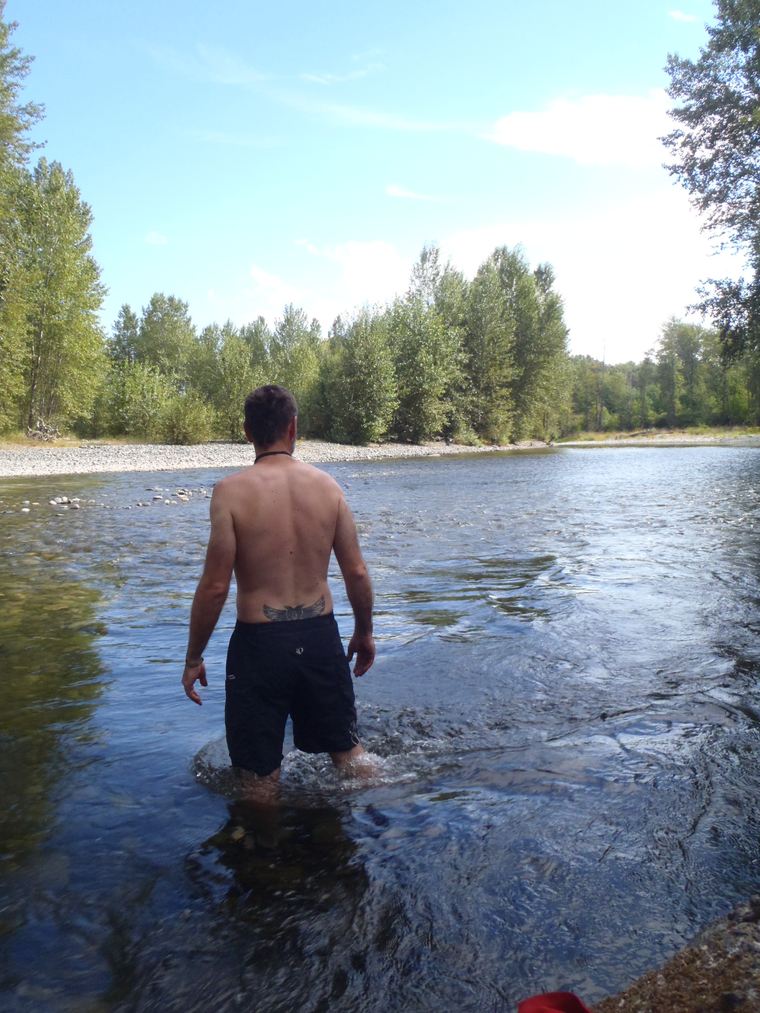 Nice winding roads, more cedar forests, gorgeous sea breezes and heavenly little sea-side cottages to enjoy as we cycle along with our beats now pumping. Thing about music is it takes my mind away and I find it hard to concentrate. So we knew we had to turn off, and I acknowledged the sign that warned ‘bridge out’ but really, like, what does ‘bridge out’ mean? Well, its obvious I suppose but as we whizzed past it I automatically read it and dismissed it, so we were shocked when, 10km down the road ,we found a huge construction site and indeed, a bridge out. First back tracking for team Bremma, so we stopped and enjoyed an icy pole to console ourselves. Then, high on sugar, we missed the turn off and ended back up on the hwy. Dow! Oh well, only 10km to go to Duncan and camp again for the night. You know the drill. We camp by a stream that we cool our hot legs in and settle down again by 8:30pm.