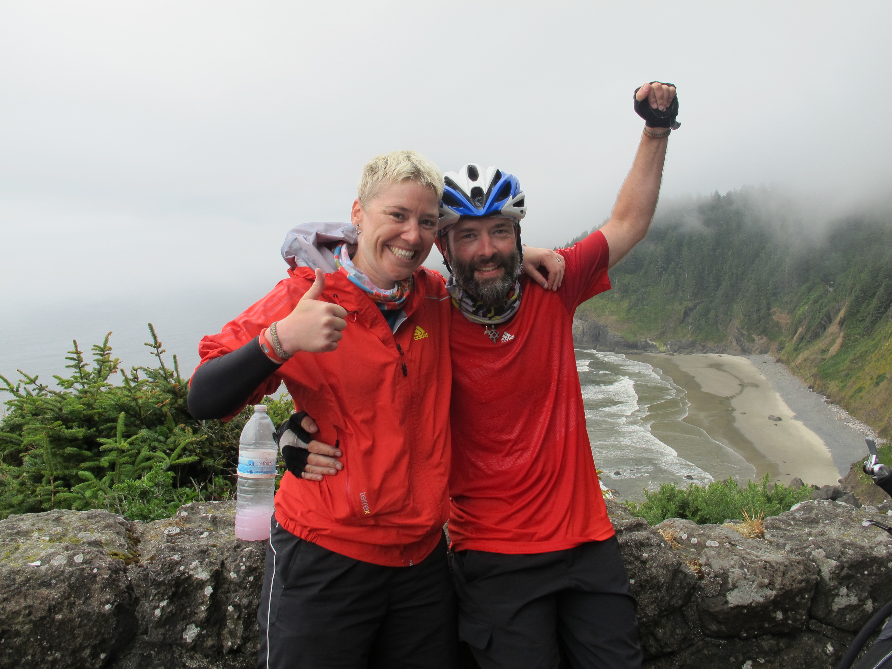 Celebrating our 1000th km with a sports drink at the look out for the Sea Lion Caves