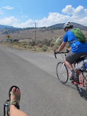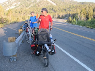 “We need to find a way to attach the rack,” he said dead-pan “the guys at the shop thought this would work”. The ride from Reno to South Lake Tahoe is 107km. One lowsy little bungey chord is not gonna hold the rack on for 5km, let alone a loaded rack. So sorting out his luggage best we could, we set off on our first ride together, Mick with pack-rack in hand, to a bike store that may actually be able to help us.