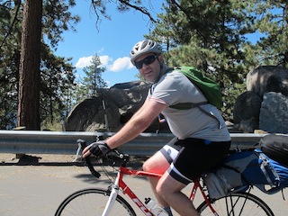 We stopped regularly and took lots of pics. Having climbed the steepest pass of the day, we took the turn off to Tahoe & had an excellent long down hill with incredible views of the sapphire blue lake. It was around 5km of fast downhill. Mick caught up with us at the bottom as we started climbing again, and was choking on his words as he tried to explain his fright at us passing him at 70kmph. We go pretty fast downhill, its true.