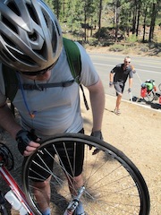 We settled into a good climbing pace again for a few kms then I heard Mick exclaim “Oh no” (or perhaps those weren’t his exact words, but words to that effect). The shoulder was particularly narrow and we were on a busy part of the Highway 50 so we called back that we would meet him at the next turn out. He was walking his bike so we assumed he had a flat tyre. Oh dear. Nope, the whole tire had blown out and a huge egg had pushed through the exterior rubber so that his wheel would not even spin. After some choice phrases were exchanged about the quality of the rental bike, the boys set about removing the wheel and trying to patch it.