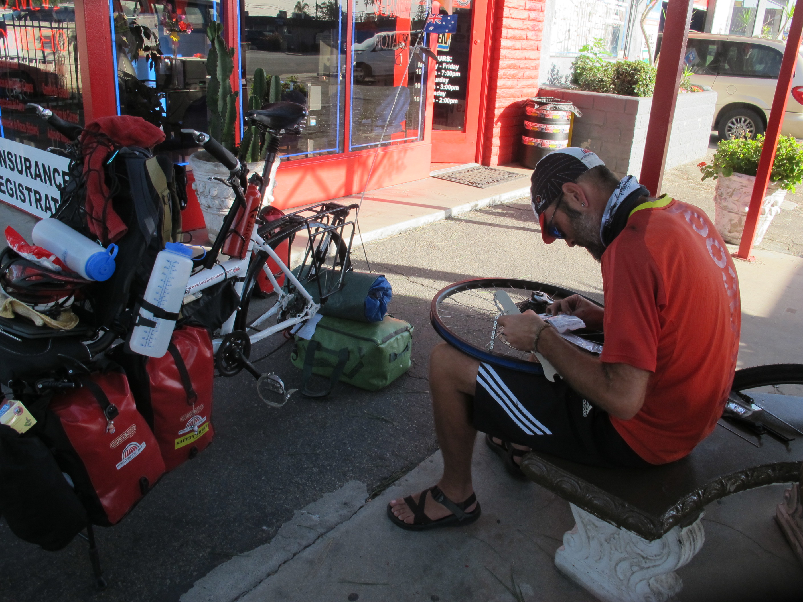 A spoke on the rear wheel just broke. Bugger. We have spares but no wrench to loosen the nut. Double bugger.