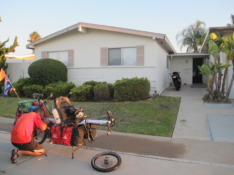 We awoke feeling slightly apprehensive about the day’s riding but optimistic about our new rear wheel. It was the last day of our USA visas so we started out bright and early on Oct 18th, ready to cross the border into Mexico. We had been staying in San Diego with  ‘Skinny Tim’, a great bloke we met while cycling the Oregon Coast. His house, or ‘The Castle’ as he & his best pals like to call it, is about a 40km ride to the border, with another 40km on the Mexican side to reach our destination in Mexico.