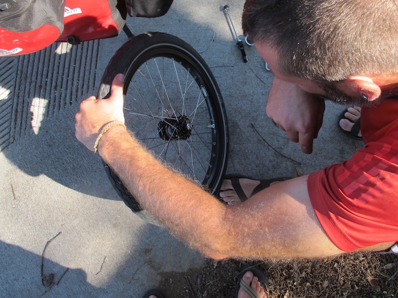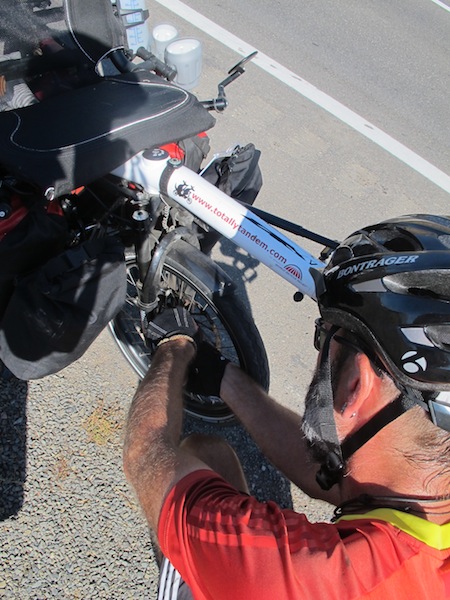 Pulling over yet again, we get to our designated tasks and replace the spoke. I should also mention that at this juncture, we also blow a front tube when tightening the new spoke. Good times.