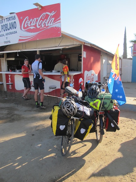 Eating well; it’s all about carbs. Oatmeal and granola for breaky starts us off well and a selection of muesli bars throughout the day to keep our energy up. Lots of pasta for dinner with whatever sauce we can whip up, grabbing fresh fruit and vegies whenever we can, but mostly we are able to get tomatoes and avocados, which make for some pretty sweet tortillas. We soak rice and lentils in a re-seal bag throughout the day so it only takes a few minutes to cook when we set-up camp. Bread is no longer a viable choice with the super hot weather, so we have converted to tortillas and have even invented a new ‘gringo snack called ‘the pbjilla’. It’s a flour tortilla smothered in peanut butter and jam, and it tastes pretty awesome. Don’t knock it till you try it!
