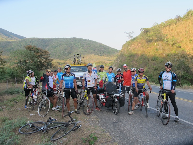 What happened next seriously shook us and I am quite certain provided extra sunlight for the day. A lycra-clad cyclist appeared around a steep mountain corner. What a sight. He instantly stopped and, recognizing our plight, began an animated conversation in Spanish. He ad no luggage and 2 empty water bottles on his bike. Being completely exhausted and overwhelmed by heat and dehydration, we didn’t have much faith in his chatter. We thanked him for whatever help he was trying to offer us, and decided to pedal on to try and reach the next toll booth for our camp site that night. The hills were endless and our new lycra-fitted friend followed us closely. We had to stop every 5km as we were totally pooped. He placed a hand on my shoulder and begged me with his eyes to stop & wait with him. We realized we couldn’t actually go on, and conceded. We didn’t know what we were waiting for until 15minutes later, a group of 30 cyclists similarly costumed, rode around the corner followed by a sag wagon. They were all wide smiles and full of questions as they pulled up and started shaking our hands. It was like a very strange dream as a jolly man leapt from the van and took our empty bottles, returning seconds later with them filled with ice cold Gatorade. Travelling by bike is seriously unbelievable sometimes.