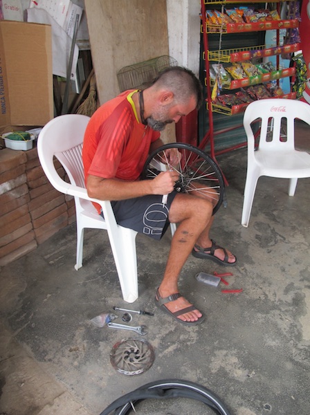 In not knowing what our next step should be, with only 5 spare spokes left and clearly dwindling, Bren has loosened and re-tensioned all of the spokes again, and now we simply have our fingers crossed. Ah, the on-going saga of the spokes. Hope you all find it amusing!