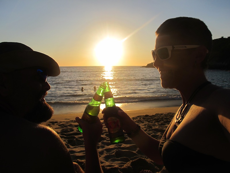 Feeling more spritely, we managed the final few kms down to the beach, only to be met by a an even more vicious wind. We were instantly assaulted by rocks and sand that the wind had chosen to throw at our bare sweaty legs, and toss at our faces. We had to quickly seek refuge, but where? A gorgeous beach lay in front of us through the screen of a sand storm, and there was just one tiny palapa (beach shack made of palm fronds).