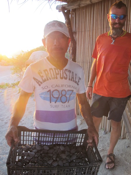 He laughs openly at me, shaking his head. “No no comida!” And then rattles off some Spanish I have no chance of understanding, but l catch a few nouns and enough verbs to realise that he has special permission to protect the turtles. In fact, he is just waiting for the sun to set so the birds won’t eat them, and then he will release them onto the beach. Would we like to help him, he asks. While I have been engaging in national geographic charades, Bren has been investigating on the beach and discovered a fenced-off area sheltering the buried eggs. Just as he comes to reveal his findings to me, Silvano ushers him into the palapa to admire the tortugitas. “Oh cool, a wood stove with rocks to cook on”. They really did look like rocks and, after all, a box of 5 hour-old-turtles is the last thing you’d expect to see on top of a stove. I should confirm here that the fire was not going on the stove and the turtles were not in any danger.