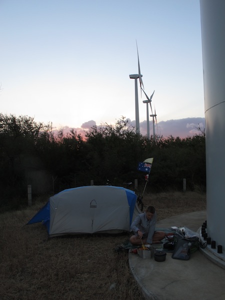 And where do you camp in gale force winds, when the wind is so strong that you just can’t pedal any further? Why, in a wind farm of course! I’m mean, it was a huge wind farm and it went for ages, and we were so exhausted from battling against the wind all day, that we just wanted to stop. We wanted to put the tent up and hide from the wind, but there was just nowhere to hide. It was brutal. So we tried to embrace the elements and found a spot to camp at the end of a dead-end road, under a huge, incredibly noisy, wind turbine. All I can say is that it seemed like a good idea at the time.
