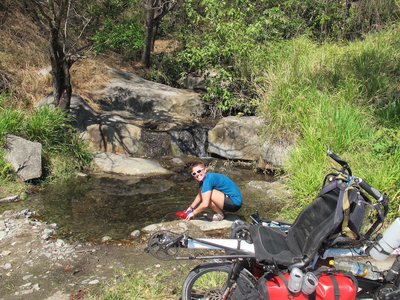 Finding a clear stream by the side of the road s a real treat. we stopped to wet our hats and tops for some air con riding